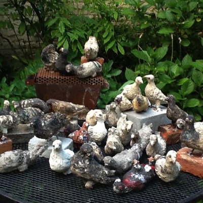 In keramiek en in raku de echte stadsduif. Het zijn er meer dan honderd, ze blijven aangroeien en verschijnen op verschillende plaatsen in de stad.